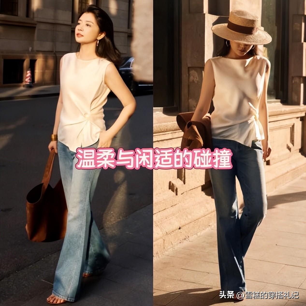 模板3:簡約溫柔風——白抽褶襯衫+牛仔褲