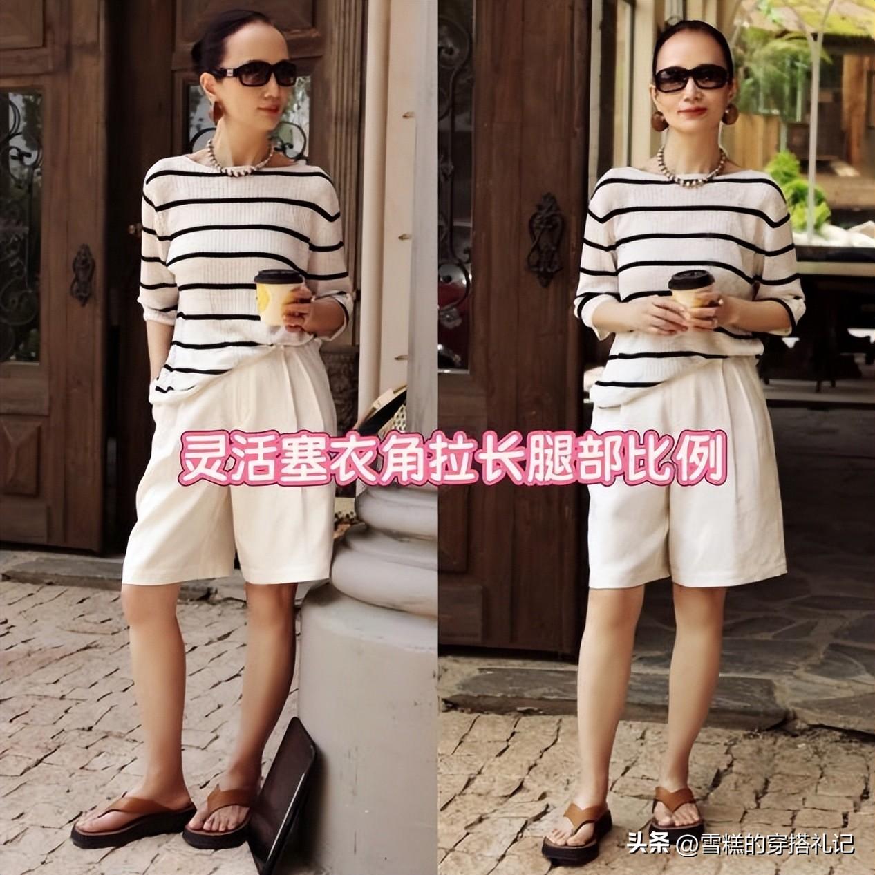 隨着氣溫回升,透氣舒適的亞麻成爲了三木母女的心頭好。亞麻自帶的褶皺感就是一種高級的鬆弛,用條紋的款式點綴,增加穿搭的時尚度。T恤塞衣角不要塞得太緊,隨意垂下一角,或者打個結,營造隨性氛圍。闊腿短褲要選有垂墜感的面料,走起路來搖曳生姿。搭配一雙勃肯鞋或平底涼鞋,頭戴一頂巴拿馬草帽,瞬間擁有度假氛圍。