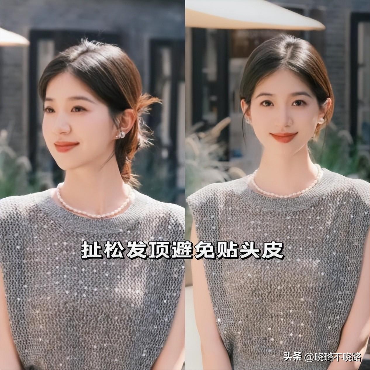 低扎發最打的問題就是頭髮梳得一絲不苟緊貼頭皮。這不僅會暴露頭型扁塌的缺陷,還會顯得人刻板老氣。在扎發前,先用手指插入髮根,輕輕抖動,吹出蓬鬆感。紮好後,用手指捏住頭頂的髮絲,輕輕向上提拉,製造出3-5釐米的“高顱頂”。這個小小的動作,能瞬間讓頭型變得飽滿立體,視覺上顯臉小一圈。