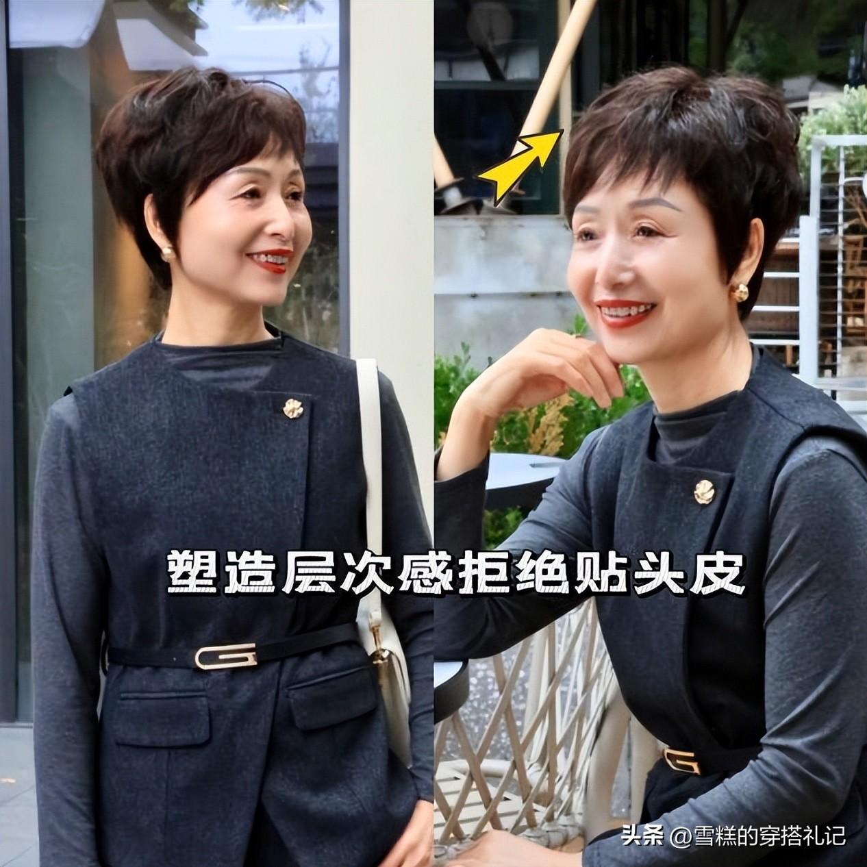 中年女性的短髮,層次是“靈魂”,沒有層次的短髮,會貼頭皮、顯扁塌,還會暴露髮量少的問題,顯得老氣;而有層次的短髮,能增加頭髮的蓬鬆感,從視覺上增多髮量,還能修飾臉型,讓整個人更有精神,更顯年輕。剪短髮時,要讓髮型師保留一定的層次,尤其是頭頂和髮尾,頭頂層次能增加蓬鬆感,避免扁塌。