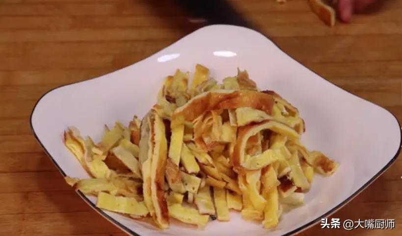 3、碗裏打入幾個雞蛋,加入適量食鹽,用筷子攪拌成雞蛋液。鍋裏倒入適量油,燒熱後倒入雞蛋液,大火煎一會兒,雞蛋凝固後攤成雞蛋皮,完全煎熟後切成細絲,盛出備用。