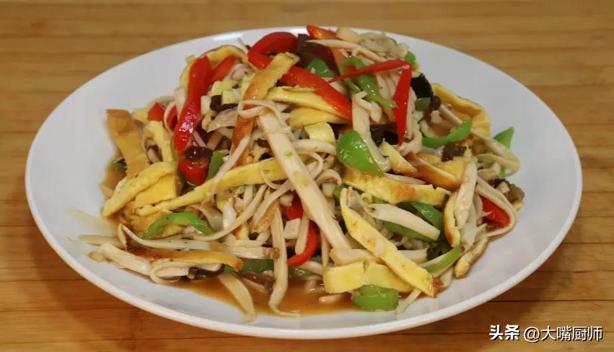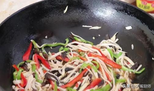4、鍋裏留底油,放入杏鮑菇絲翻炒一會兒,變軟後加入青紅椒絲、木耳絲翻炒,斷生後淋入調好的料汁,倒入炒好的雞蛋塊,大火翻炒收汁,即可出鍋。