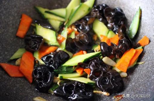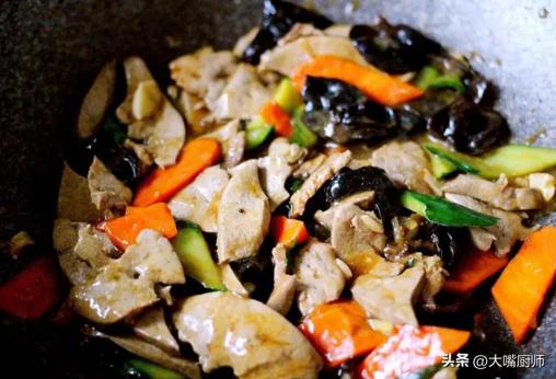 3、起鍋加油燒熱,放入薑絲爆香,倒入醃好的豬肝快速翻炒至變色,盛出備用。鍋裏留底油,放入姜蒜爆香爆香,倒入胡蘿蔔、黑木耳炒一會會兒。