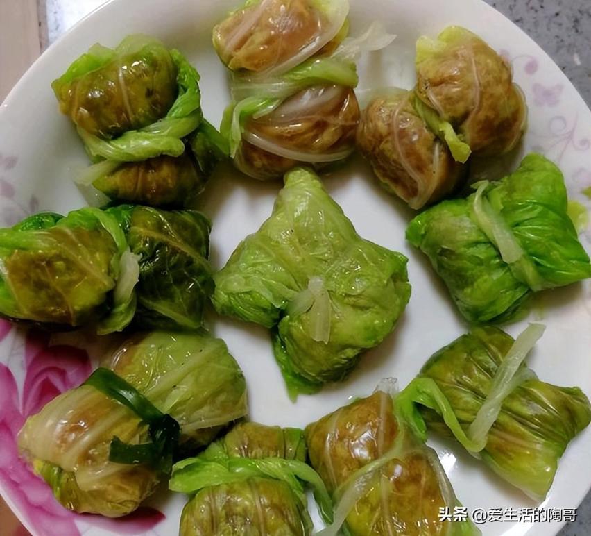 3白菜葉平鋪,把肉末均勻放進去,捲起來,包好,放進盤子裏