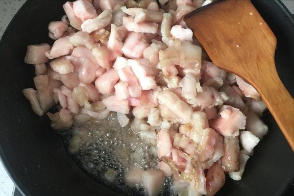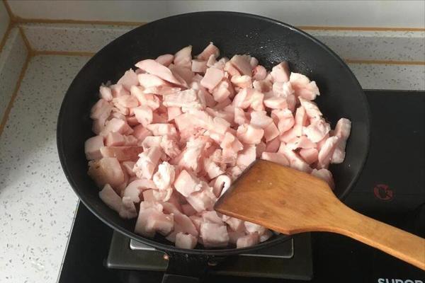 1、豬板油買不到,就用肥豬肉,當然了還是豬板油更好,買來後清洗一下,切成片狀,倒在鍋裏。