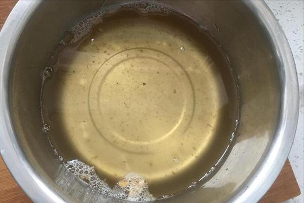 3、用大火來熬製,等到湯水變少,開始咕嘟咕嘟冒泡了,這時候我們轉爲小火,用小火來慢慢熬製,熬製的過程中,豬板油就變得越來越黃,逐漸的裏面的油分,也都被熬出來了,豬板油變成了酥脆的豬油渣。