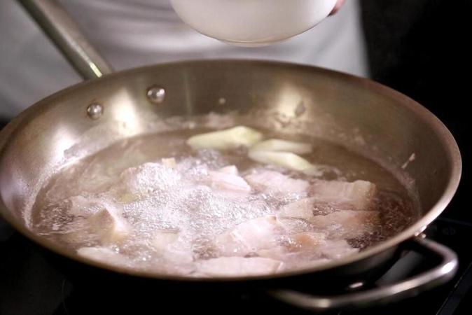 2、往裏面加幾片薑片,再倒上點料酒,添上適量的清水進行焯水,焯水的過程中,出現的大量浮沫,要將其全部撇掉,焯水後撈出來。把鍋子刷洗乾淨後,將豬板油重新倒進去,然後倒入半碗清水,不要太多了。