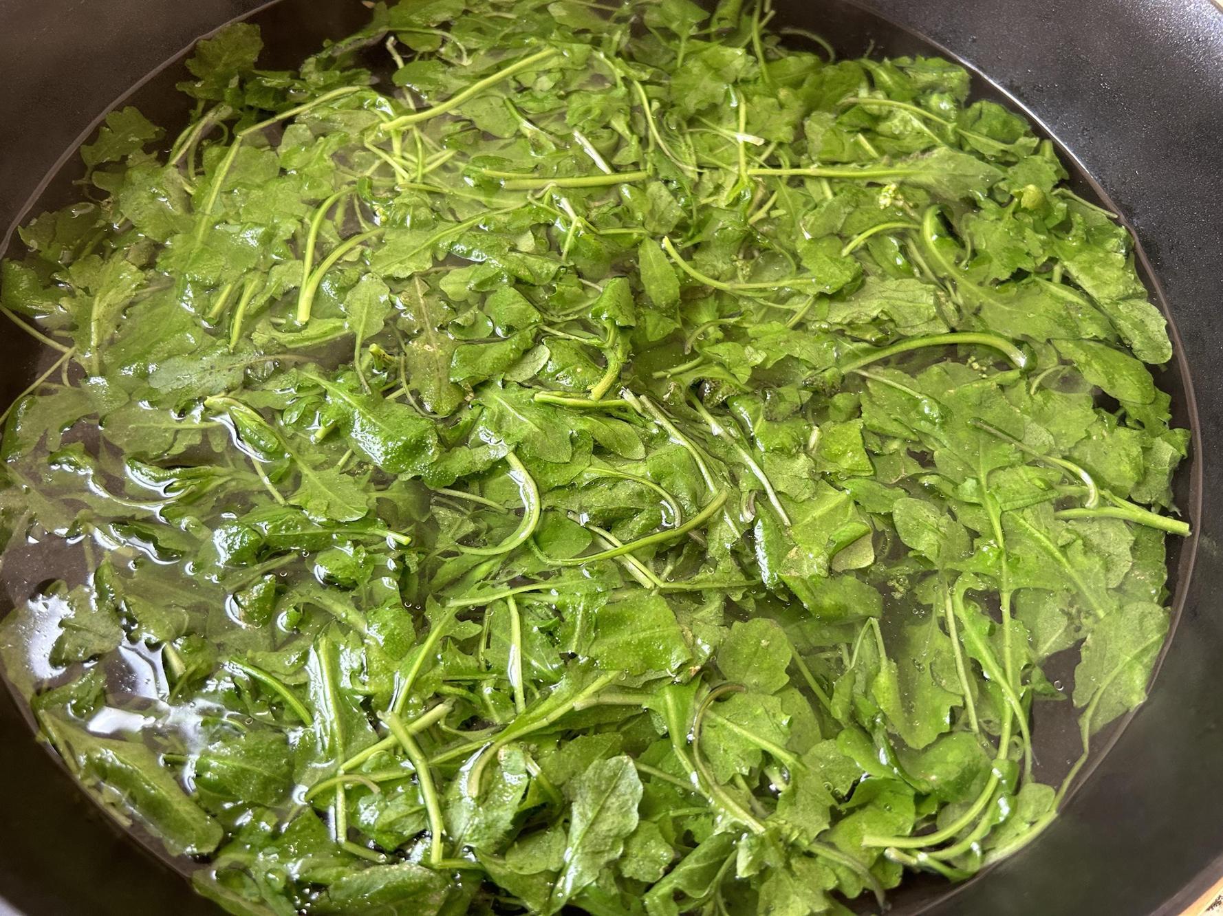 燒一鍋熱開水,放入一勺鹽和幾滴食用油,保持大火加熱,把薺菜放入開水裏,焯水大約15秒。冬天的薺菜本身比較嫩,焯水時間不要太長,避免營養流失。