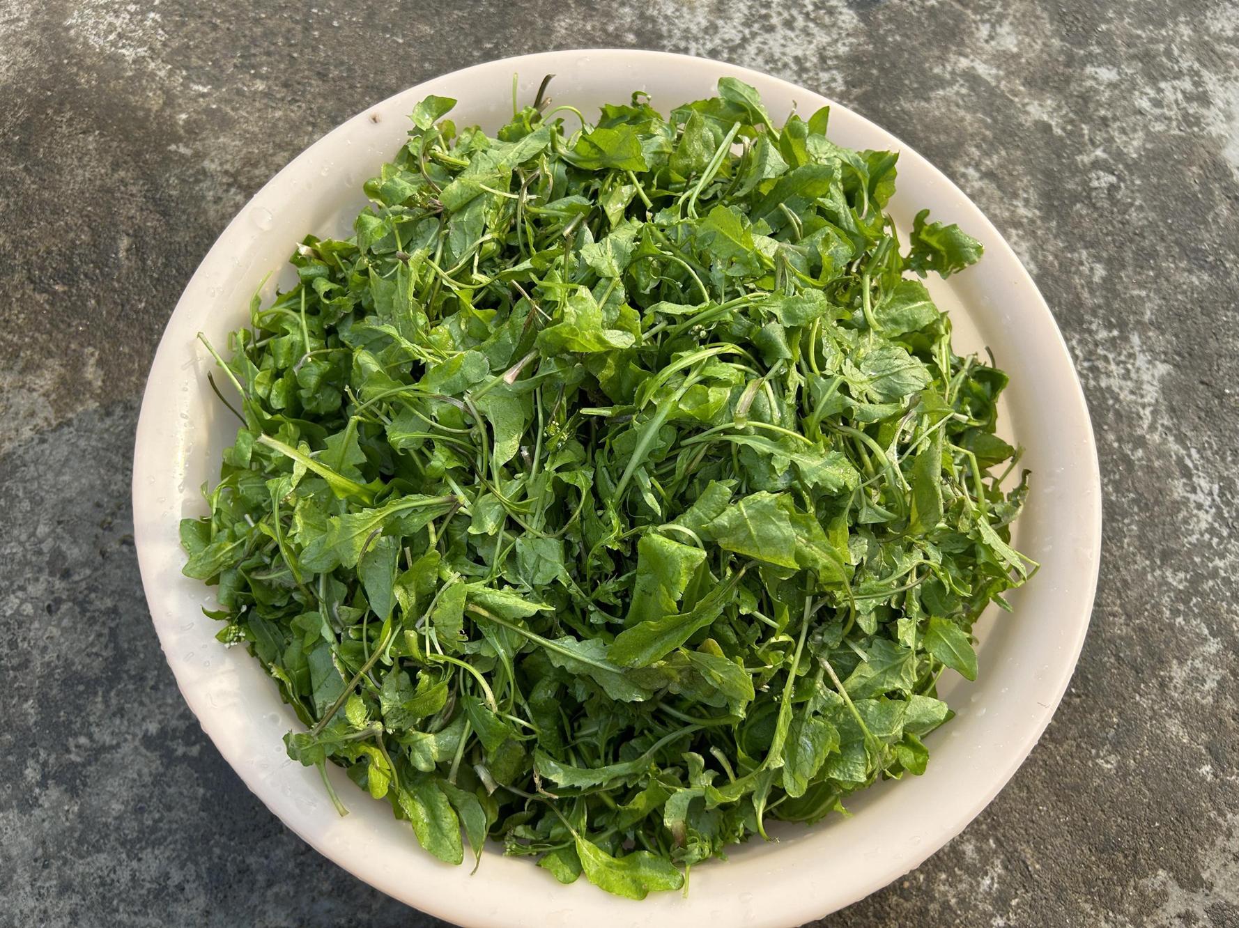 賣野菜的阿姨說薺菜已經摘掉了根部和黃色的焦葉,簡單清洗過,回來還得再清洗幾次。這一盆薺菜大約是4斤的分量,這次買了20斤,洗了好幾個小時才洗完。好喫的野菜,真的值得用心去清洗。
