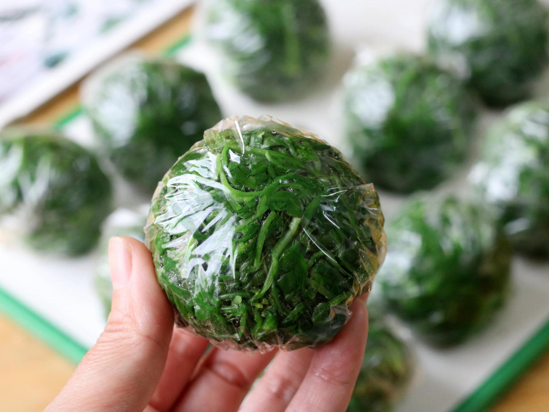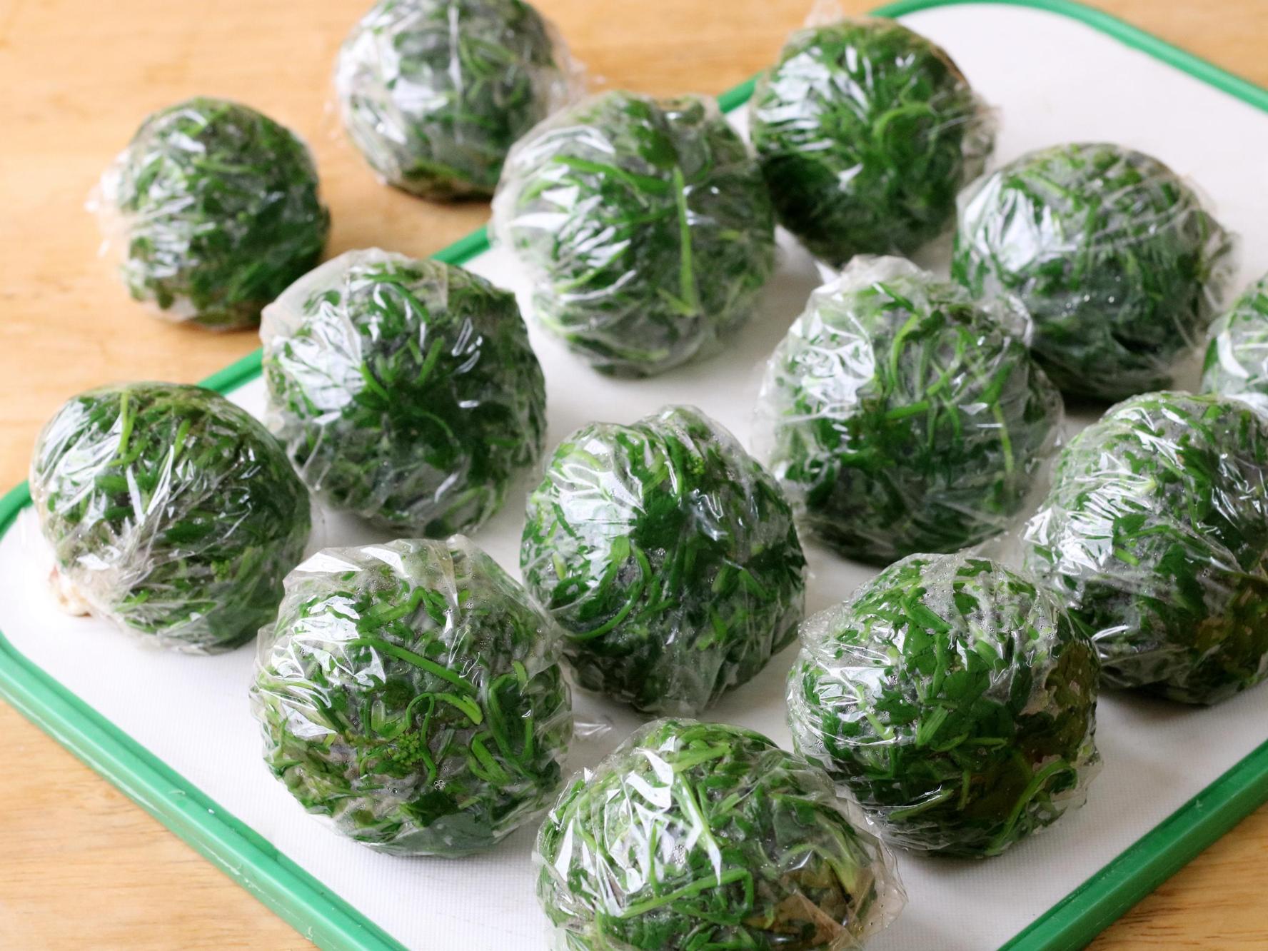 再用保鮮膜或者保鮮袋把薺菜包起來,放到冰箱裏冷凍保存。想喫薺菜的時候取2-3份出來,解凍後直接就可以用來做菜。