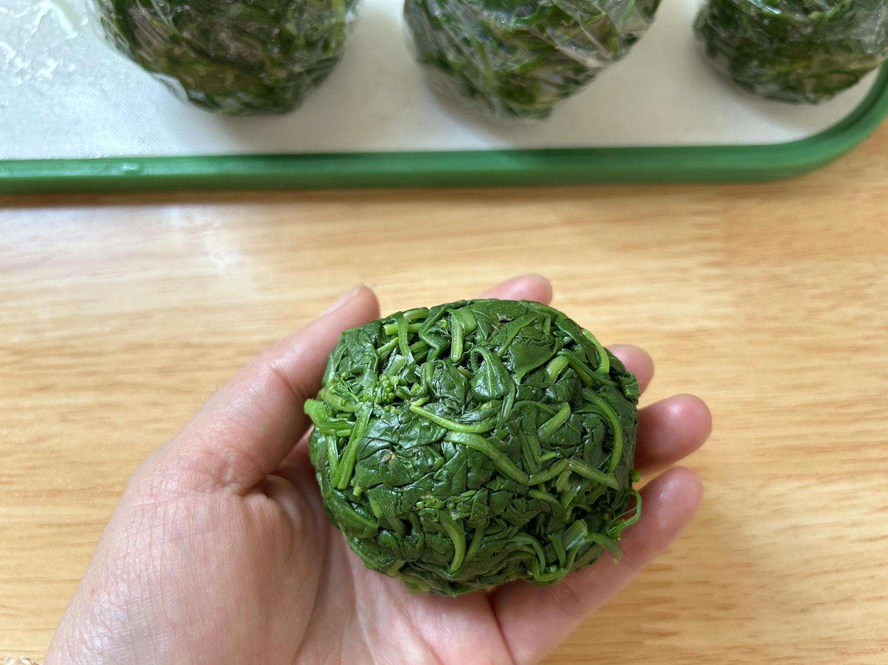 薺菜簡單擠一下水分,分成合適的大小,弄成圓形。薺菜分小份,方便解凍的同時,還能避免一大袋芥菜反覆解凍滋生細菌。