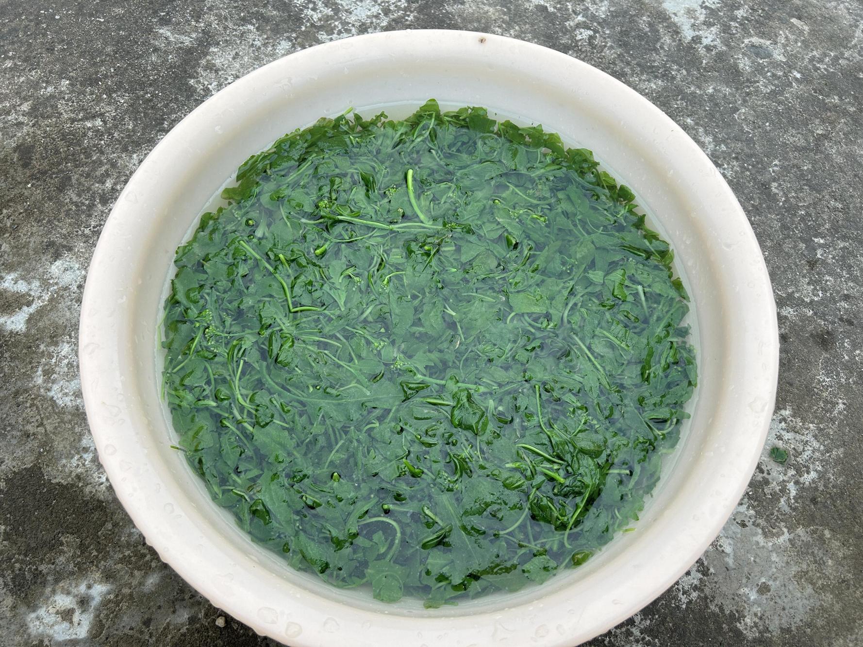 盆子裏放入適量的水,把薺菜分成若干份,每次大約洗1-2斤比較合適。薺菜清洗的時候動作要輕,別把葉子洗傷了。洗3-4次,洗到盆子裏的水底摸起來沒有泥沙就可以了。