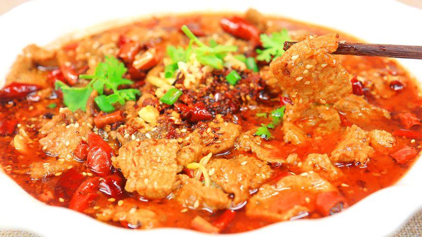 4、鍋內油燒熱以後,放入一小撮麻椒,花椒,倒入泡椒段和姜蒜片,開小火一起炒香。放入豆瓣醬和火鍋底料,炒出紅油鹽,倒入適量的清水。轉小火熬兩分鐘,然後把料汁撈乾淨。加入食鹽、胡椒粉、雞精和白糖,湯汁沸騰以後轉小火,放入牛肉片快速滑煮一分鐘,變色以後盛出來放入盤中。再澆上湯汁,倒入蒜末,倒口辣椒和幹辣椒。撒上花椒麪和白芝麻。鍋中燒一些辣椒油,油溫六成熱時,把熱油澆在辣椒上面,水煮牛肉就做好了。