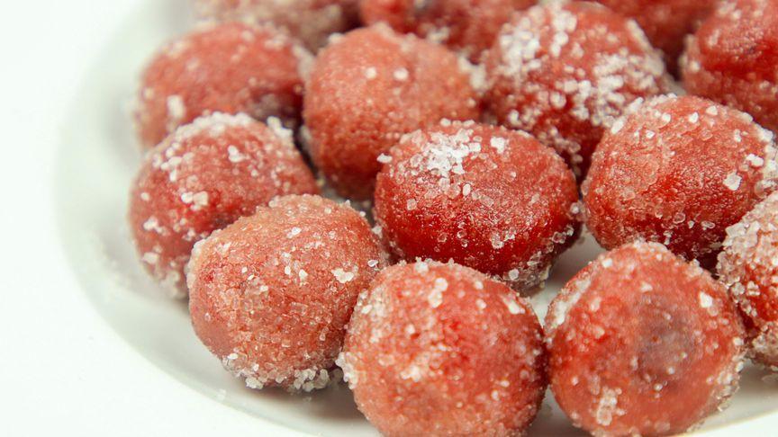 2、再準備一個小盆,撒上細砂糖。山楂果醬涼了以後,手上抹上一層植物油,挖出一勺至山楂果醬,在手心團成球,放在盤中。均勻的裹上一層細砂糖,山楂球就做好了。