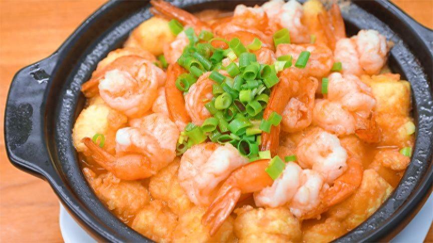 3、熱油把蝦仁也倒入鍋中炸一下,鍋內留底油,放入蝦殼、蝦頭煸炒出蝦油,再放入生薑,適量的清水。開大火熬上五分鐘,砂鍋加入適量的底油,把姜蒜粒平附在鍋底,把炸好的豆腐、蝦仁、鮮蝦湯放進去。加入少許白糖、食鹽調味,再撒上小蔥花,燜上兩三分鐘,蝦仁豆腐煲就做好了。
