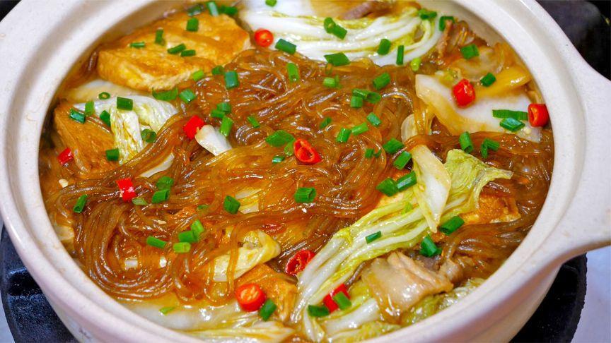 2、粉條中加少許老抽,食用油拌勻,鍋中加少許的油,把豆腐煎制兩面金黃,然後下蔥姜醬調米辣炒出香味,菜梗翻炒幾下,把白菜葉炒軟後開始調味,少許的白糖、十三香、蠔油,生抽翻炒均勻,炒出香味。轉入砂鍋中燉三分鐘。好了,最後撒上蔥花就可以了。