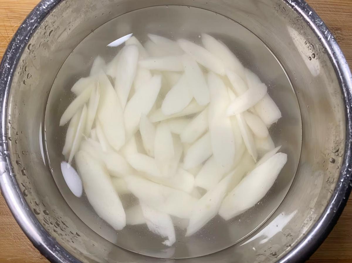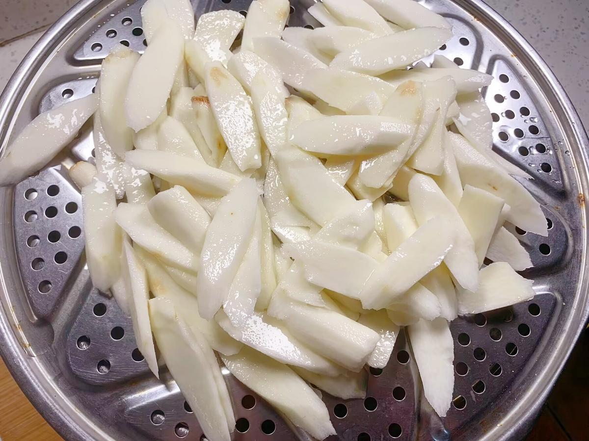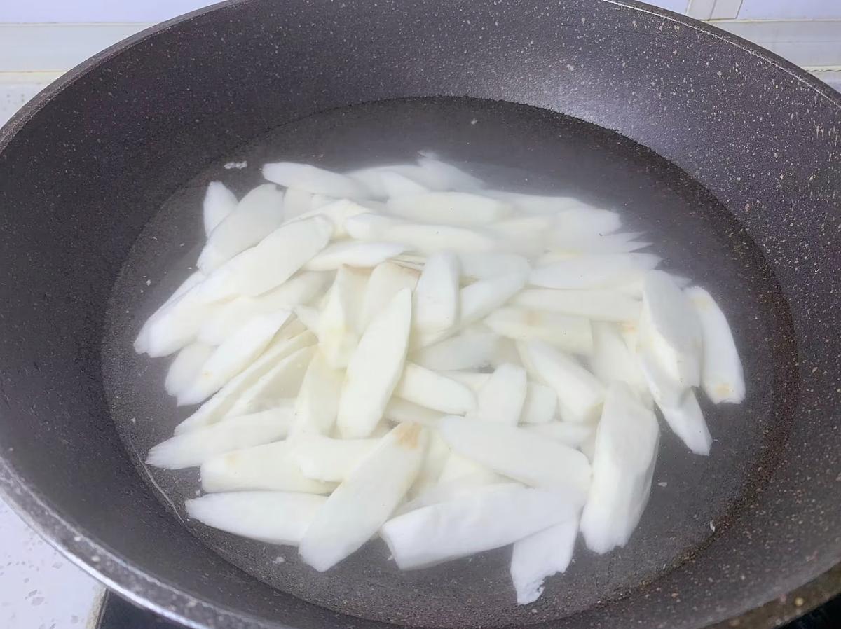 2、山藥去皮後如果長時間不喫會氧化變黑,因此爲了避免山藥晾曬過程中氧化變黑,需要把山藥放入水中煮一下,焯水還能去除山藥中的鞣製,不然喫起來很澀,煮的時間也不要太久,水沸騰後煮30秒就可以。