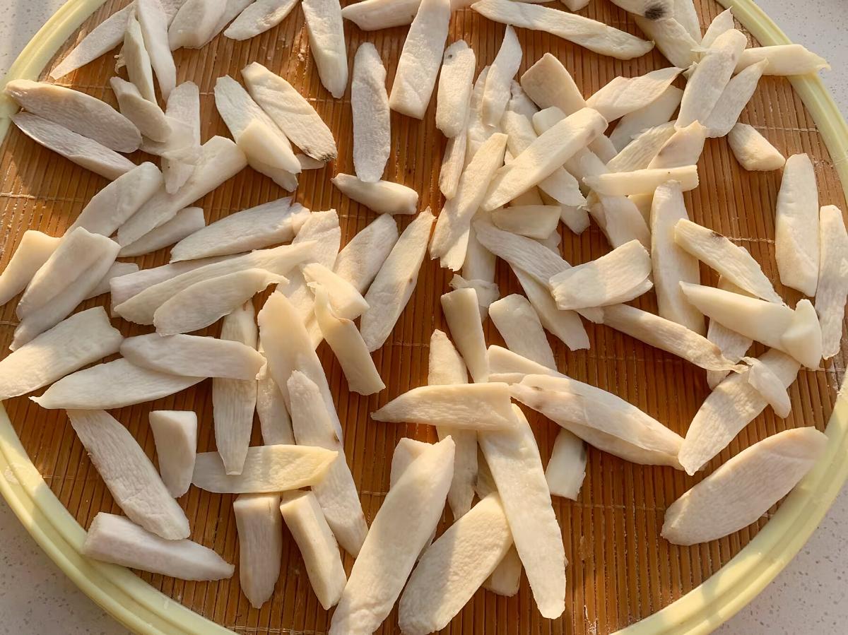 4、下圖是我曬了一整天的樣子,表面水分已經曬乾,翻下面後繼續曬,直到把山藥曬乾,手捏上去很脆,一掰就斷,這樣就曬好了。