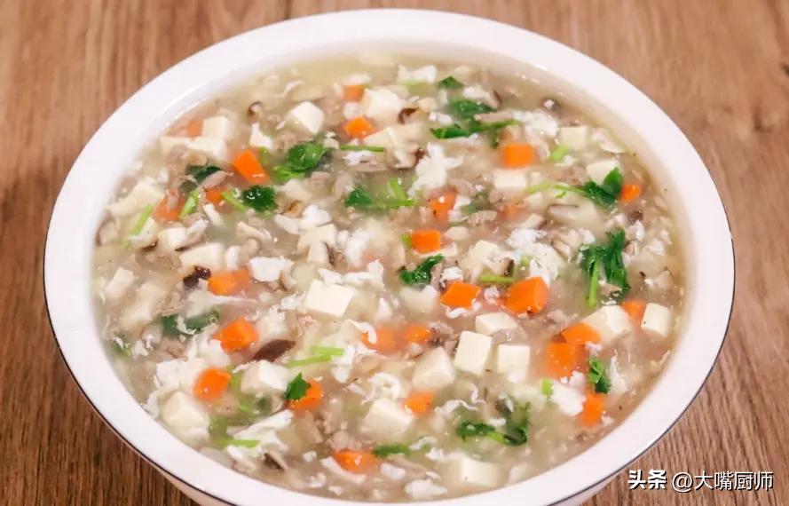 3、鍋裏重新加水,燒開後放入牛肉粒、胡蘿蔔、香菇、嫩豆腐,攪拌均勻後繼續煮3分鐘,加入適量食鹽、白胡椒粉、雞精調味,淋入水澱粉勾芡,讓湯汁變得濃稠。