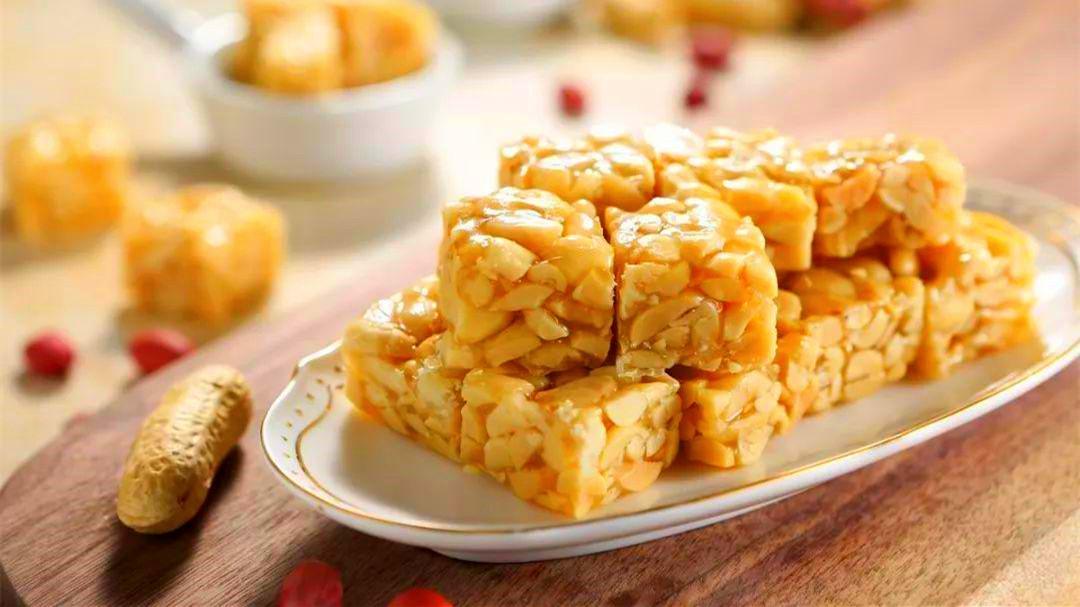 第三種:花生糖,這是過年招待客人最常見的小零食,主料是花生,花生炒熟後去皮,然後熬糖漿、掛糖,由於口味酥脆甘甜,所以也深受喜愛。花生又叫長生果,寓意長壽健康;又由於花生裏面的果仁很多,能寓意多子多福。