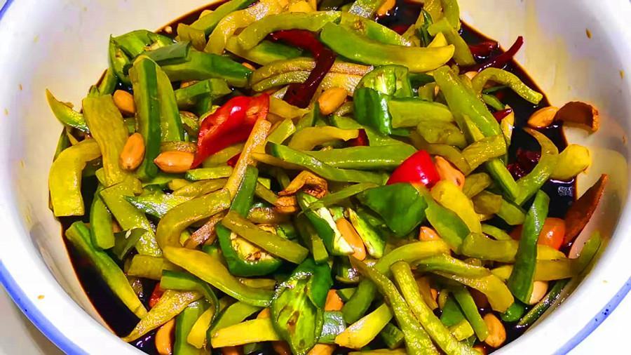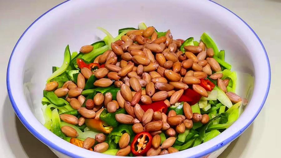 4.這時蘿蔔條也就醃製好了,放到紗布中用力擠乾淨水分後倒入盆中,接着把花生米也倒入,再加一點青紅椒塊點綴顏色,最後將涼透的料汁倒入,攪拌均勻後,蓋上保鮮膜,放到冰箱中冷藏保存即可,第二天就可以喫了,隨喫隨取,解饞又下飯!