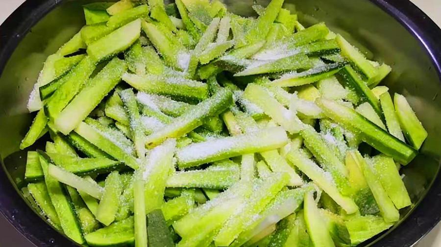 1.青蘿蔔洗淨後,先切片再切條,然後放入盆裏,加入適量的鹽抓拌均勻,然後放一邊醃製半個小時左右。目的是醃製出蘿蔔中水分,使醃製好的蘿蔔口感更清脆。