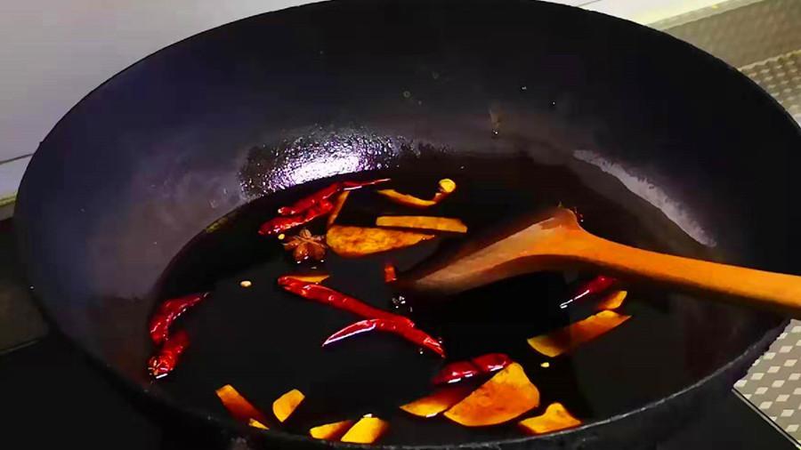 3.再燒個料汁:起鍋不用加油,倒入一碗生抽、一碗味極鮮、半碗清水,接着加入勺白糖,適量的幹辣椒、薑片、八角、花椒和桂皮,大火燒開後即可關火,倒出放入盆中讓其完全涼透備用。