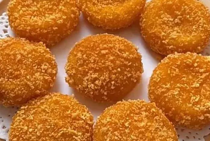 3、每一個劑子,都團成圓球狀,然後按扁,按扁以後準備適量的麪包糠,在南瓜餅的表面,裹上適量的麪包糠,接下來準備來炸。鍋中刷一層薄薄的油即可,不要太多了,然後將南瓜餅放進去,煎到金黃後翻面,直至兩面金黃,出鍋開喫。