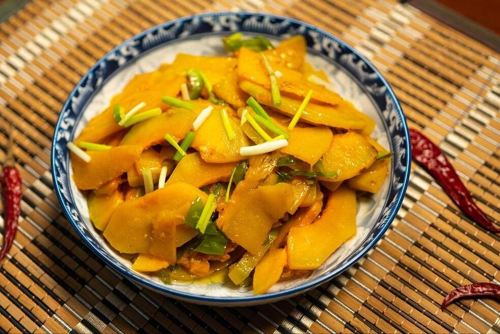 南瓜,咱們洗乾淨之後,把外皮削掉,也可以不去掉,切成片狀備用。鍋內倒油,燒熱後直接下入南瓜,開始翻炒,將其炒到變軟之後,往其中加上適量的鹽、雞精來調味,別的一律不用放,炒勻以後撒上蔥花,就可以出鍋啦。