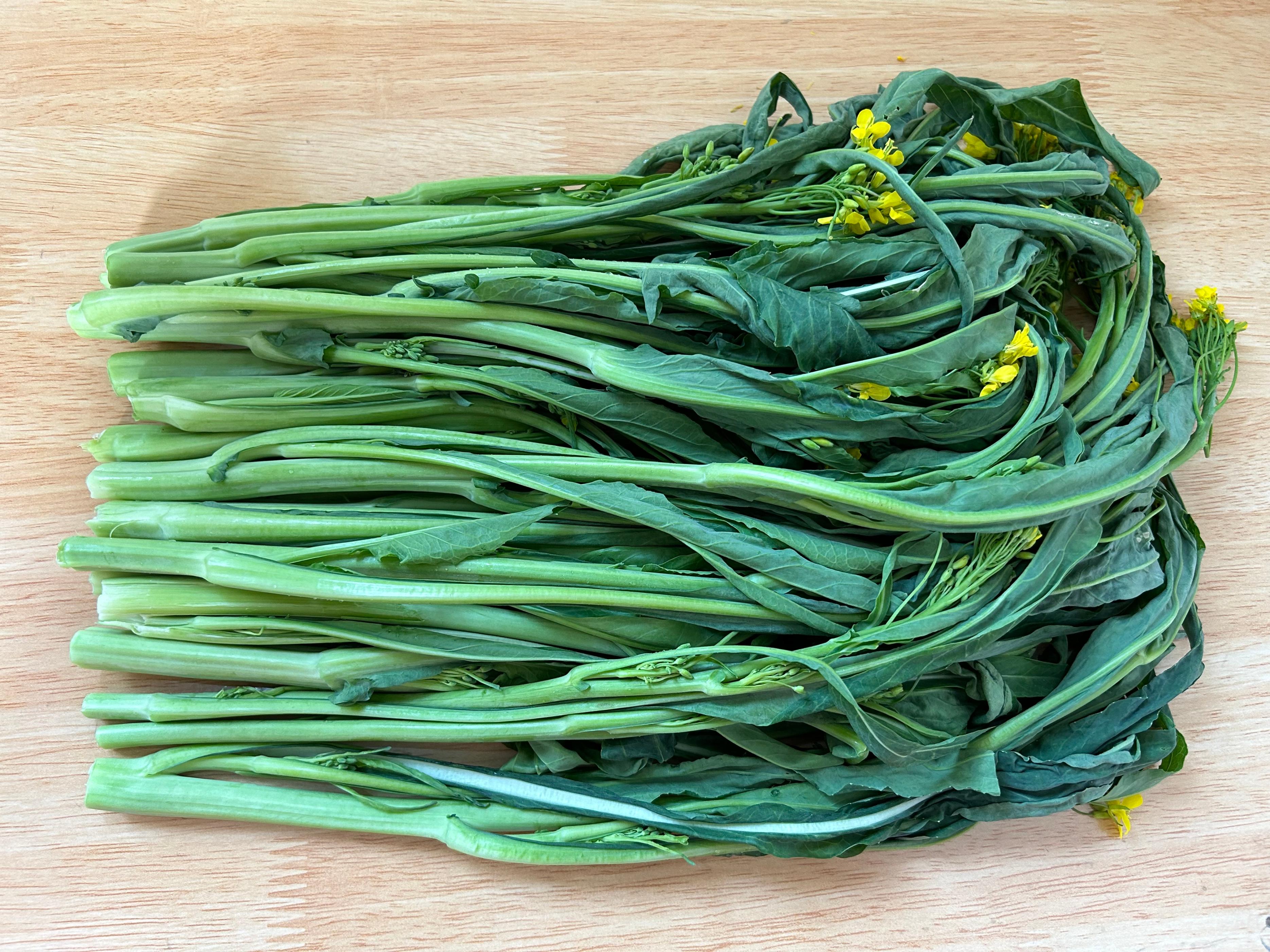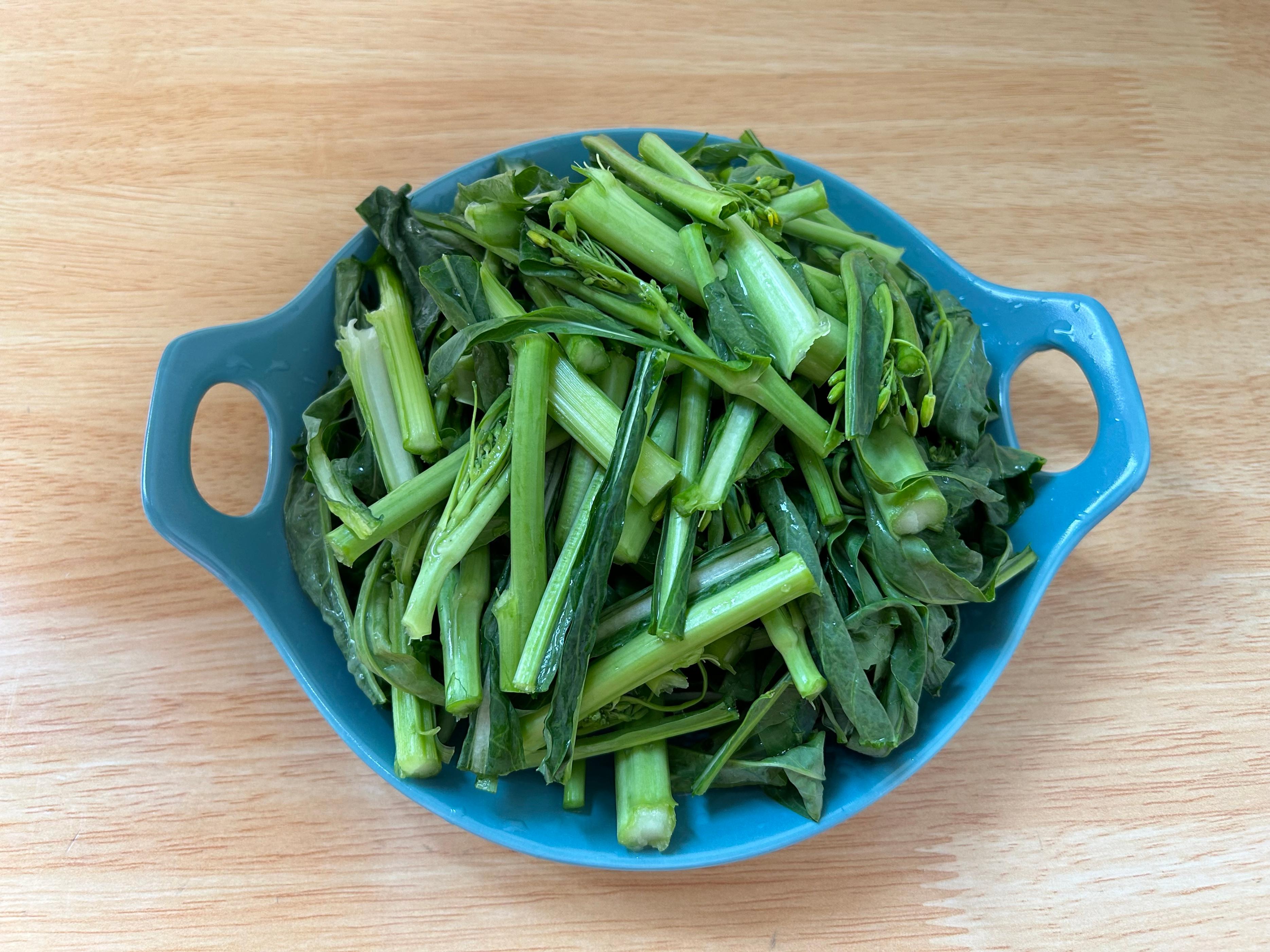 菜薹摘成合適的長度,冬天的菜薹很嫩,莖幹也不用剝皮,基本上沒有可以丟掉的部分。