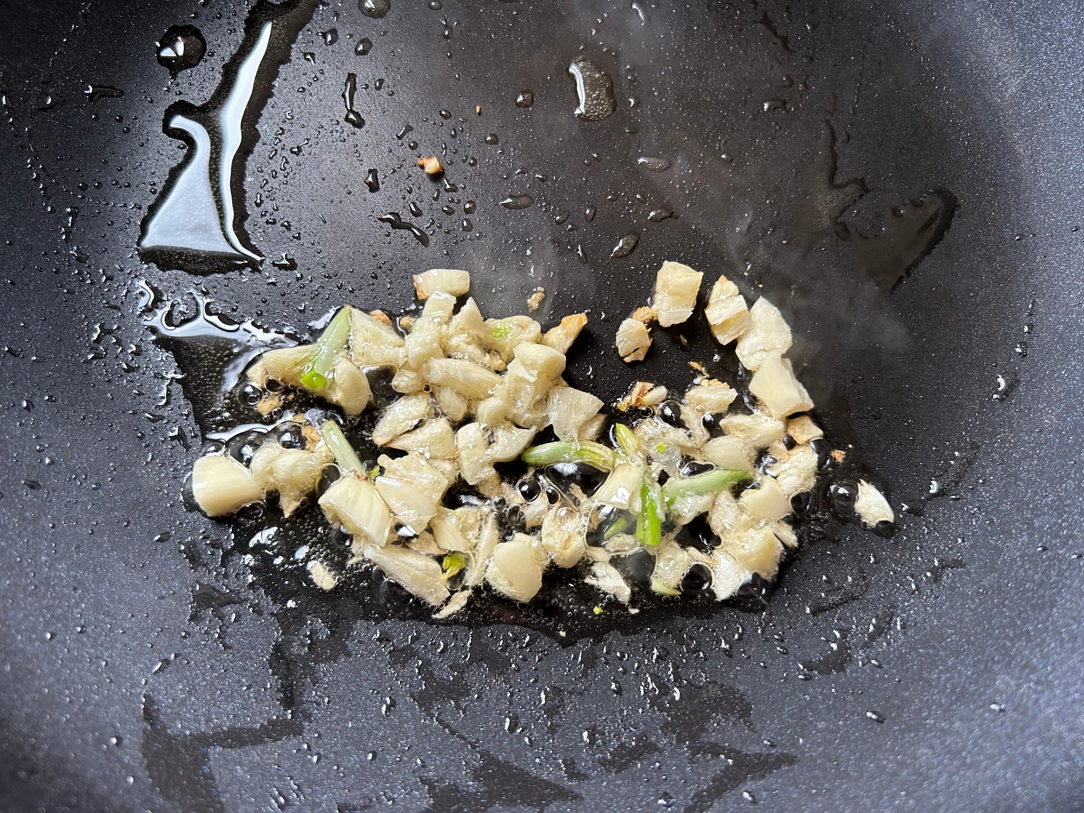 熱鍋放油,放入大蒜熗鍋,翻炒出香味。炒青菜用豬油,比其他食用油好喫很多。