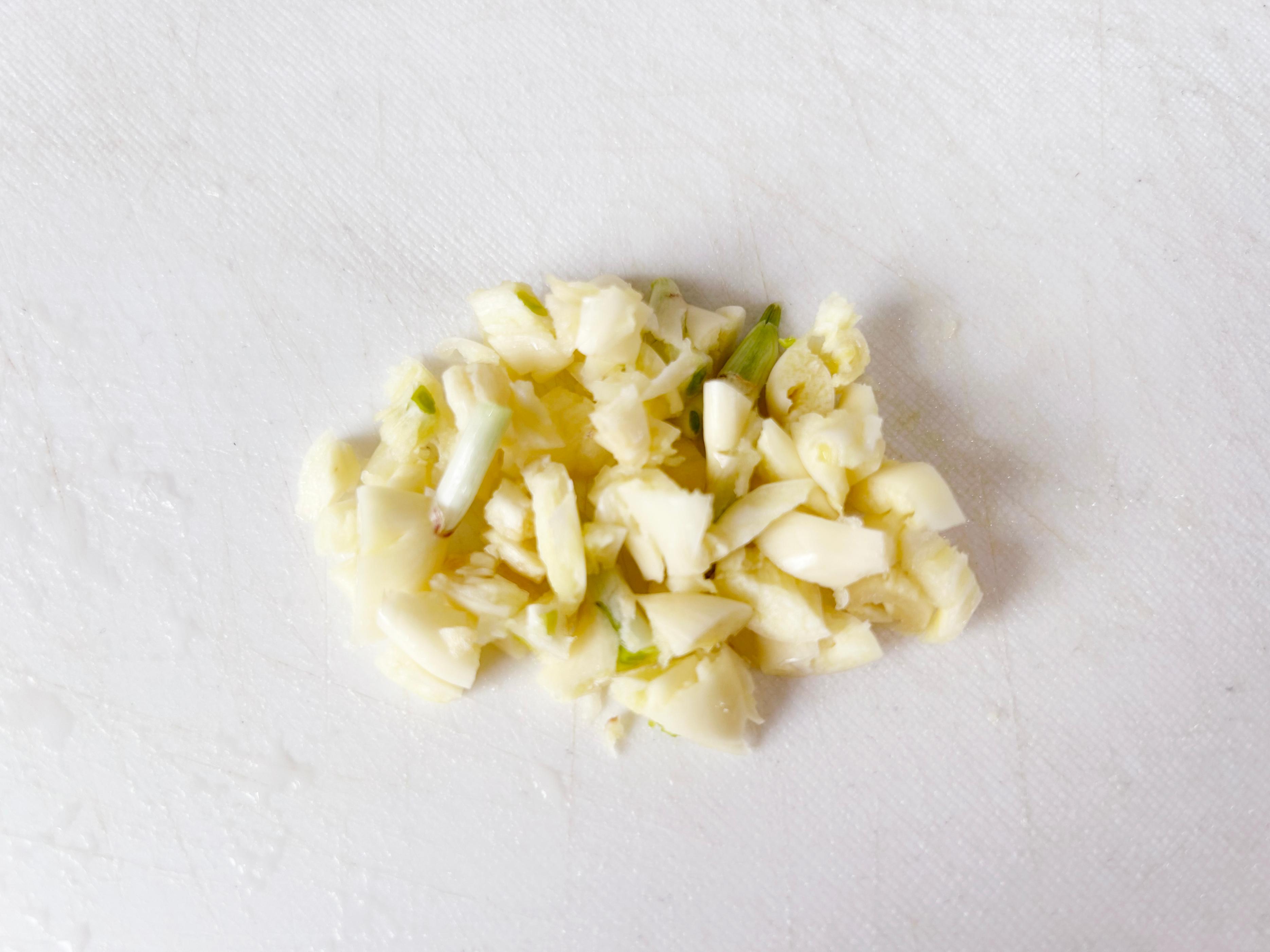 大蒜拍扁去皮,切成小顆粒。大蒜中含有大蒜辣素,做菜放一點有殺菌消炎的好處。