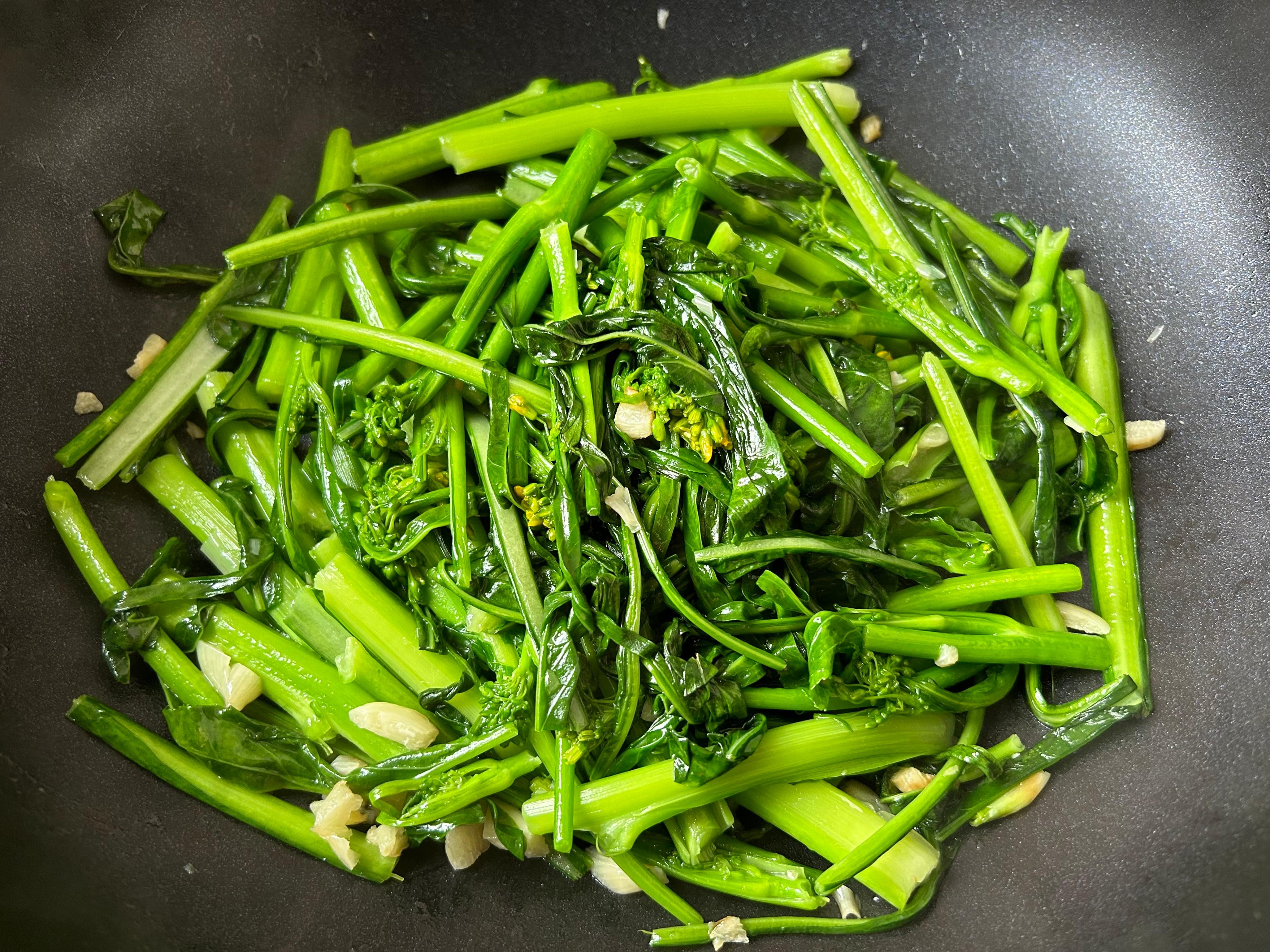 放入菜薹,大火翻炒到熟透,炒的過程中要勤翻動,避免炒焦了。