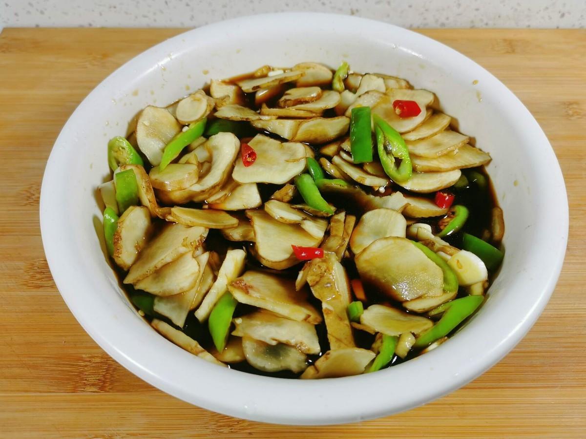 將洋薑片放入醃製料中,確保每片洋姜都能夠均勻裹上醃製料。然後,將其放入冰箱醃製一段時間,讓洋姜充分吸收醃製料的味道。