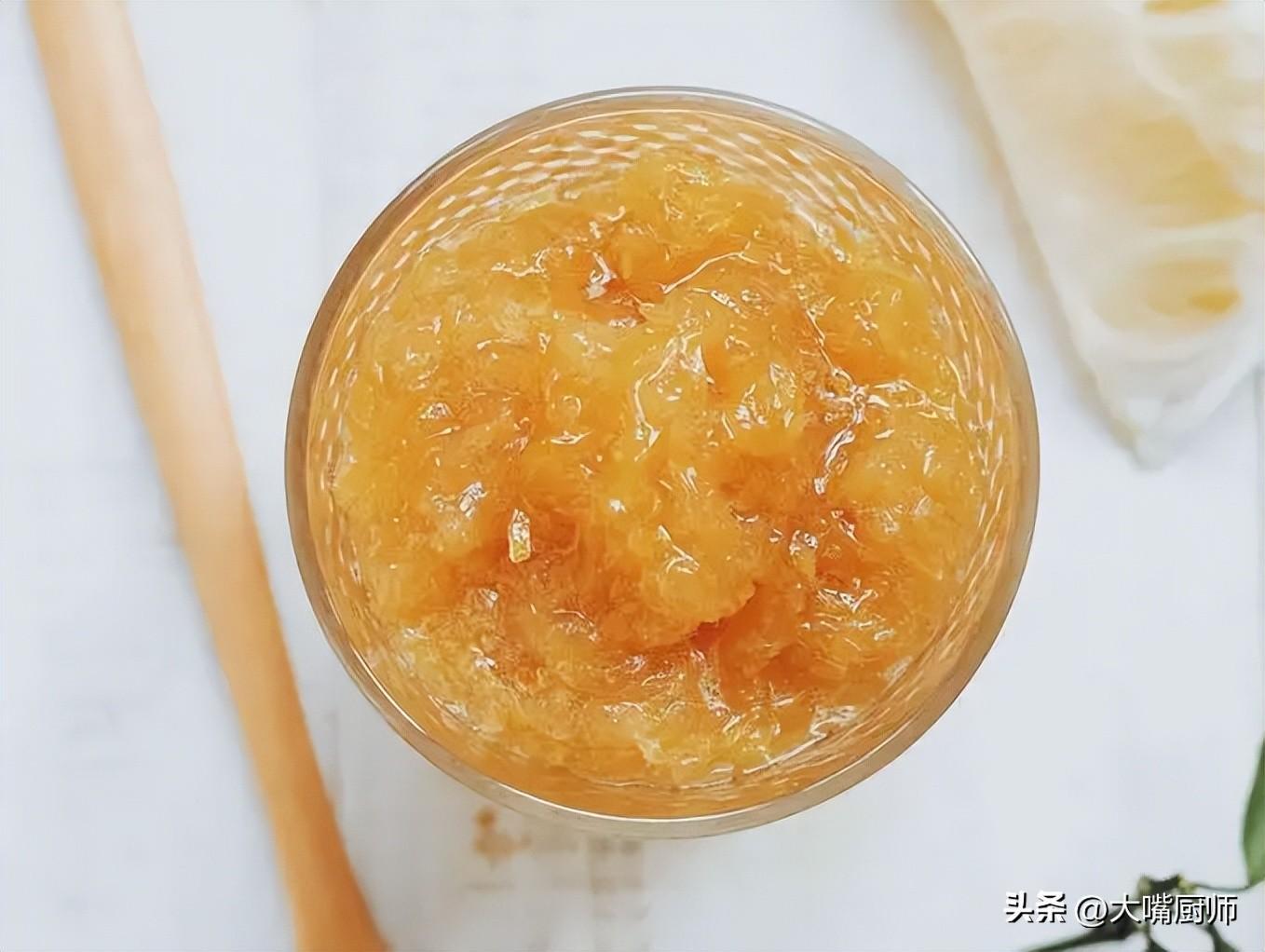 3、鍋裏重新加水,放入柚子皮、柚子肉,再加入適量冰糖,大火煮開後轉小火煮,不停地攪拌,把水分煮幹,等到變得比較粘稠時,加入適量蜂蜜攪拌均勻,裝入玻璃瓶裏,冷藏保存。食用方法很簡單,舀一勺蜂蜜柚子茶放入杯中,倒入溫開水沖泡即可。