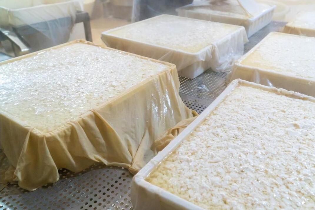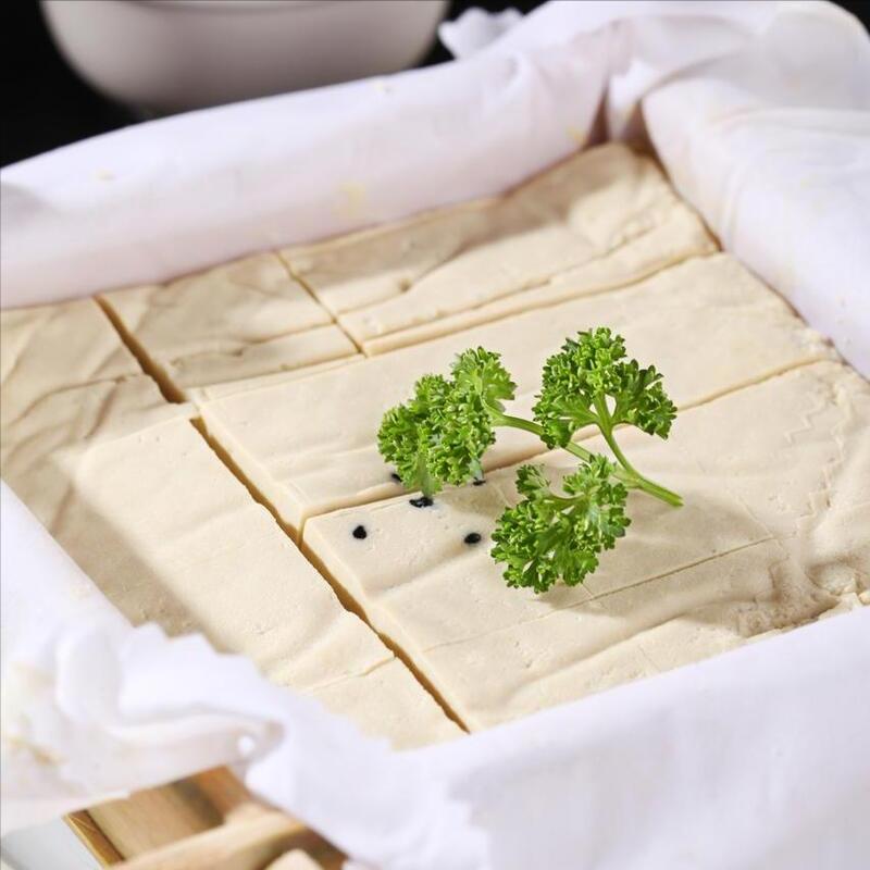 7、鋪一層紗布,再將豆花倒進去,然後上面也鋪上紗布,蓋起來以後,在上面放一個重物壓着,等上幾個小時,等到涼透了以後,豆腐就徹底定型了,把紗布取出來,咱們的豆腐就做好啦。