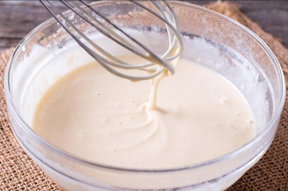 4、要想炸出來的蘑菇,更加蓬鬆、酥脆的話,就不要用水調麪糊,換成啤酒試試看,這是要點之二。倒入啤酒,充分攪拌,直至沒有顆粒爲止,稀稠程度和酸奶差不多就行,然後將蘑菇倒在麪糊中。