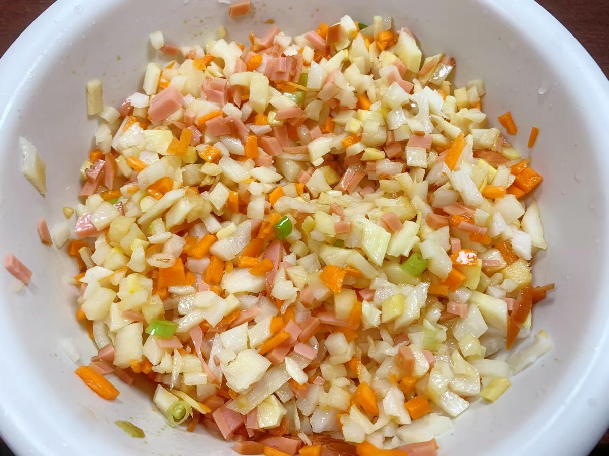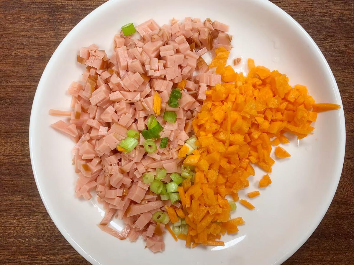 2、接下來再準備一些配菜,根據個人口感來搭配就可以,老公不喜歡喫肉,就放了一些香腸,喜歡喫肉的可以放一些豬肉餡或者牛肉餡,再切一些胡蘿蔔碎和香蔥碎,切好放一旁備用。