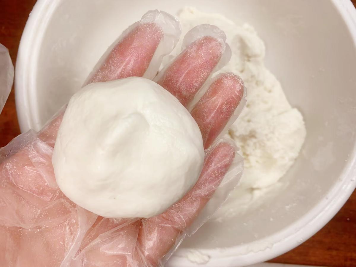 6、菜餡塞好後,轉着圈的將口收緊實,把它團成一個糰子,切記皮不要太薄,不然容易露菜餡。