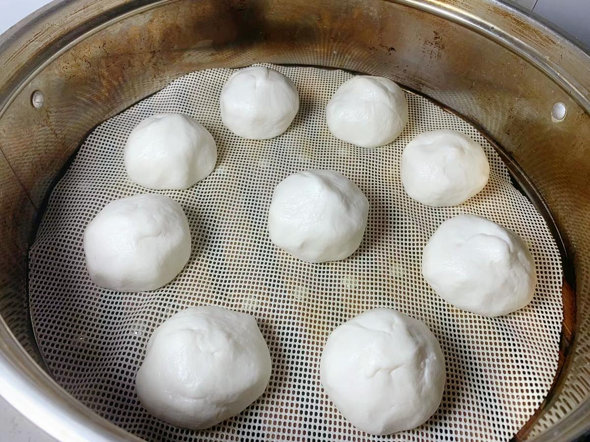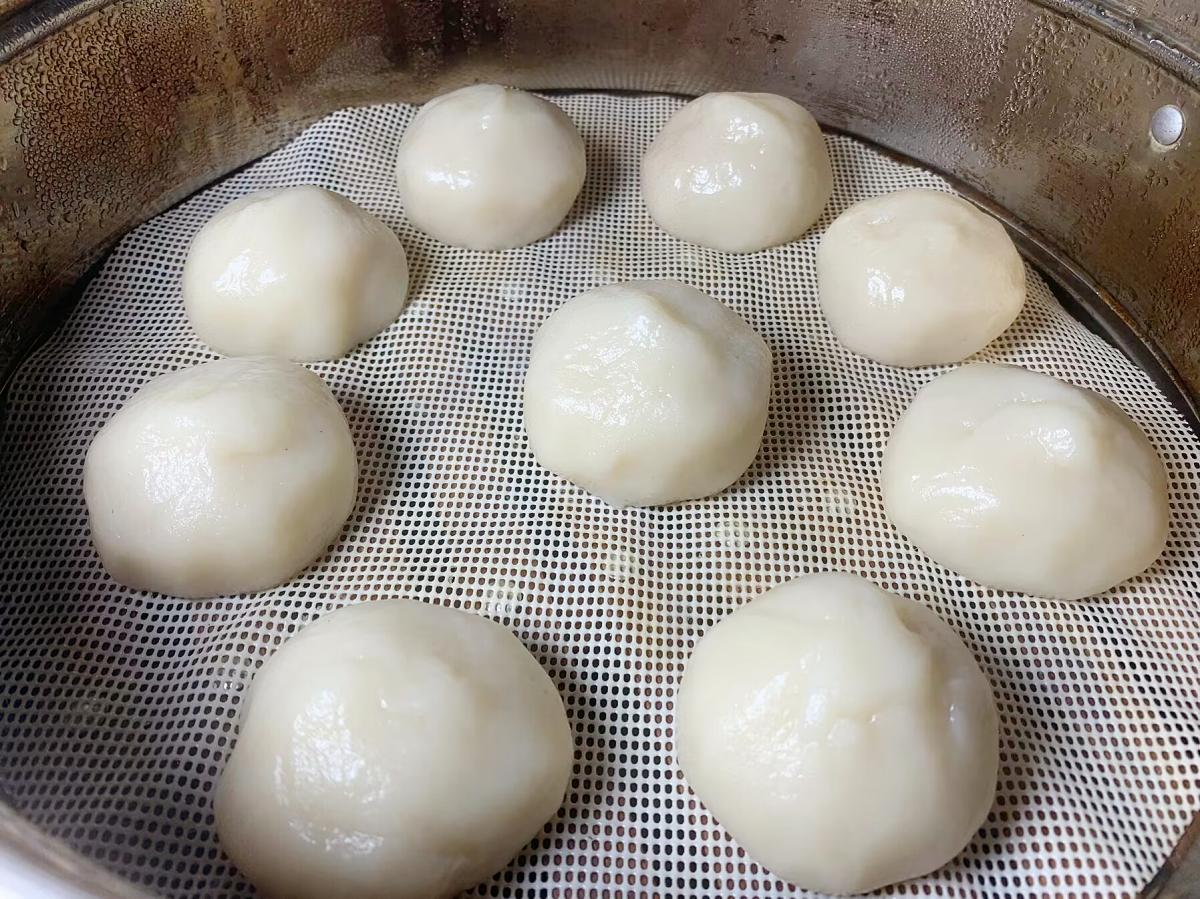 8、關火後,用夾子把蒸熟的糯米冬筍包子取出來放在盤子內,端上桌食用就可以。