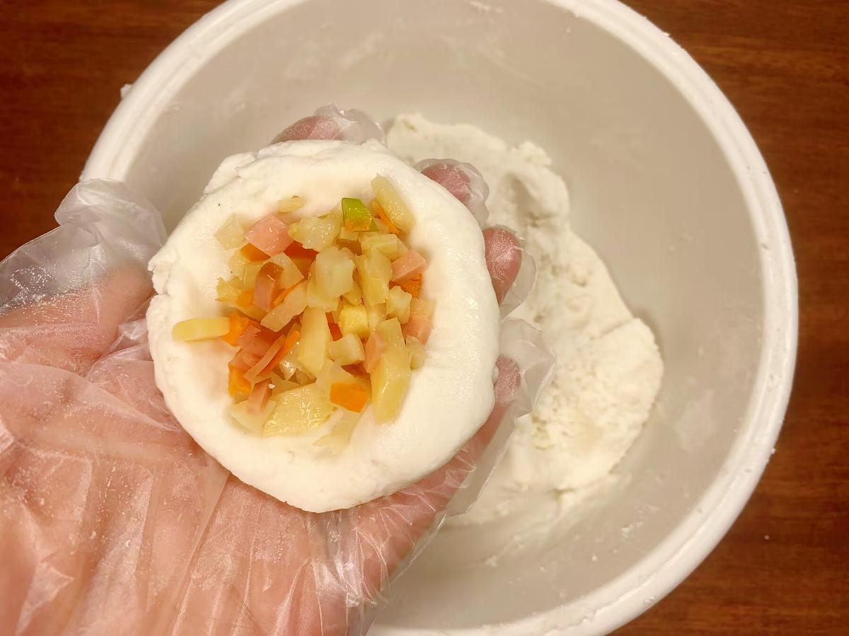5、揪一小塊糯米麪團,用手把它摁壓平,中間摁壓出一個小窩形狀,放入適量菜餡。