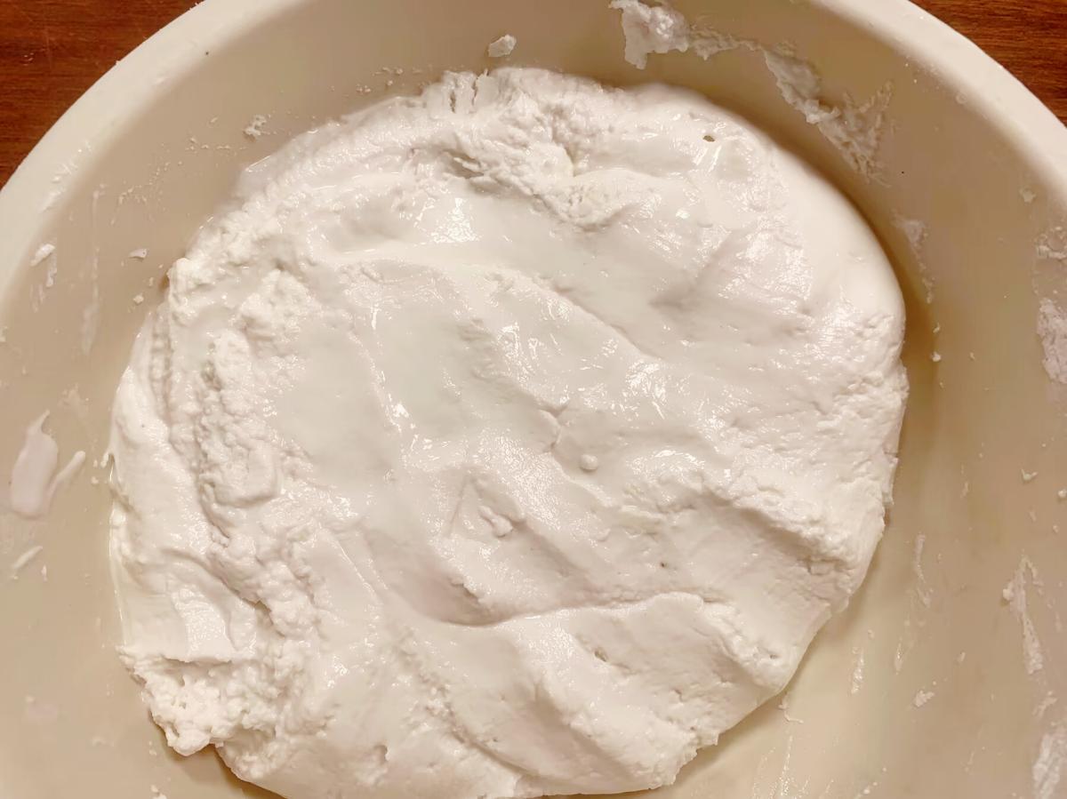 4、接下來準備適量糯米麪倒入盆內,淋入清水,下手捏成軟硬適中的麪糰。
