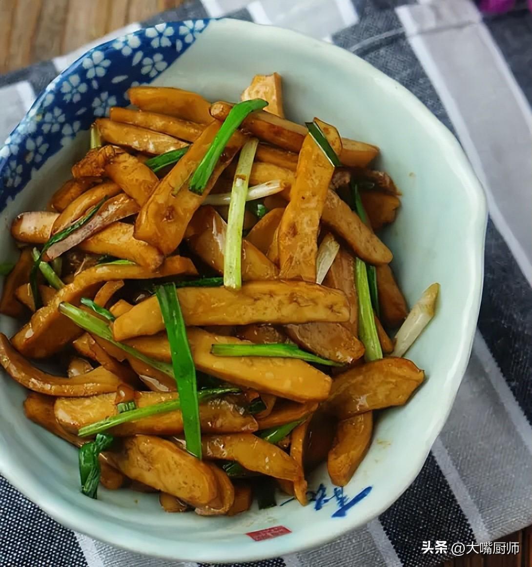 1、豆乾洗乾淨,切成細條。香蔥剝洗乾淨,切成蔥段。鍋里加入適量油,燒熱後放入豆腐乾,小火煸炒一會兒,炒至豆乾顏色焦黃,加入適量醬油、料酒、食鹽調味。
