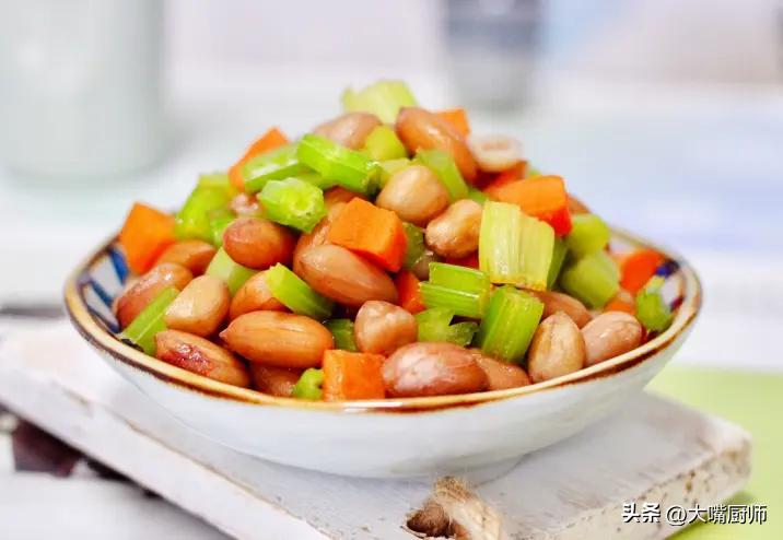 3、重新起鍋,加入適量食鹽、食用油,放入芹菜、胡蘿蔔,焯水2分鐘,斷生後撈出過涼水,瀝乾水分後放入碗中,加入花生米,放入適量食鹽、生抽、雞精、香油,翻拌均勻即可出鍋。