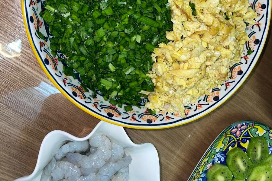 用到:韭菜、蝦仁、木耳、雞蛋、香油、鹽、味精、蠔油