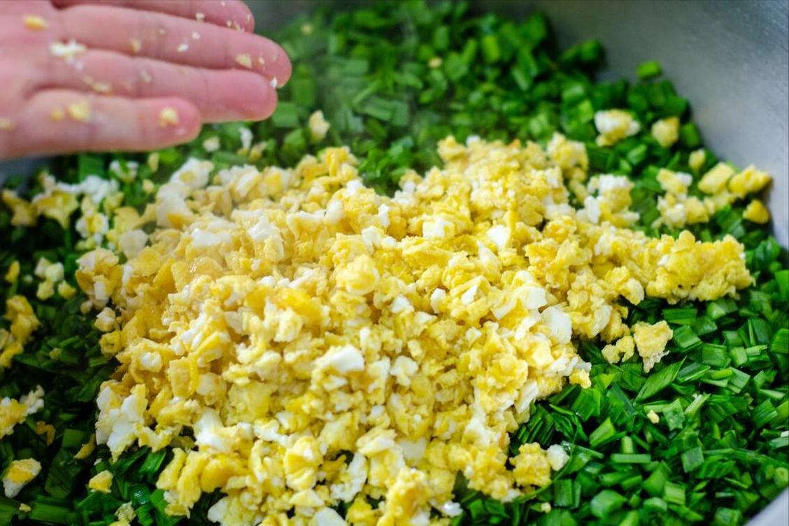 調韭菜餡,各位要記住,切忌直接加調料,不然韭菜遇到鹽,就肯定會出水的,這個毋庸置疑。