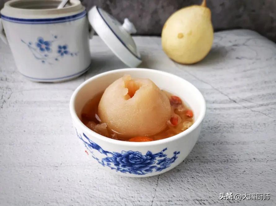 1、雪梨洗乾淨,去不去皮都可以,用刀削掉頂部,1/3就可以了。用勺子把中間的梨核挖出來,注意別把底部挖穿了,然後在中間放幾顆冰糖、枸杞,倒入適量清水。