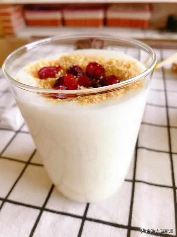 2、把打好的熱牛奶山藥糊加入適量白糖攪拌均勻,倒入杯子裏,撒上一些即食燕麥片和乾果,攪拌均勻就可以喫了。