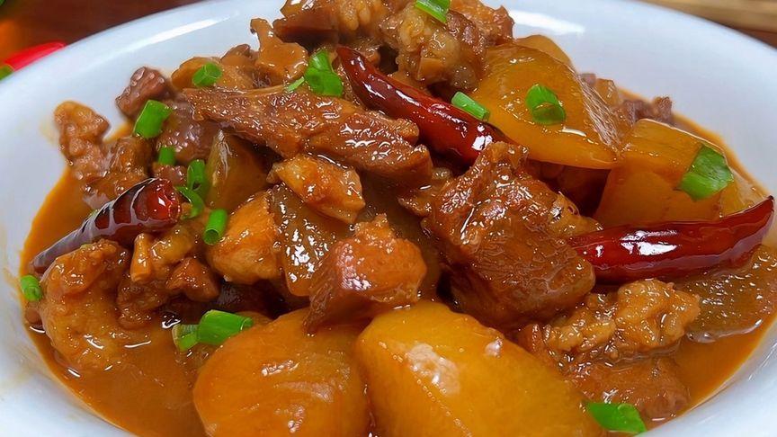 2、鍋中油燒熱,把羊肉控下水,放入蔥、姜、幹辣椒,把羊肉的香味激發出來,炒出多餘油脂,加一勺黃豆醬、老抽、生抽,胡椒粉,蠔油、一罐啤酒,一點水,開小火燉35分鐘。羊肉燉爛了,白蘿蔔倒進來,再蓋上小火慢燉15分鐘,開大火收下汁,可以再放一點鹽,把汁水收至濃郁,蘿蔔燉羊肉就做好了。