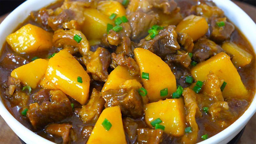 2、牛肉直接冷水下鍋,加入一些料酒,大火煮開,血沫打撈乾淨。撈出來倒入溫水,將牛肉清洗乾淨。油熱後倒入蔥姜和香料,炒出香味。倒入牛肉炒香炒幹,加入一勺豆瓣醬,火鍋底料,老抽上色,生抽,炒出紅油,再倒入開水,開大火燉一個半小時,加入少許食鹽,雞精,牛肉已經燉的非常軟爛了,然後再倒入土豆,燒至十分鐘,把湯汁收的濃稠一些,土豆燒牛肉就做好了。